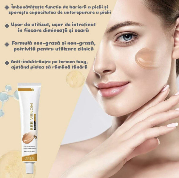 Crema cu venin de albine are posibilitatea să întinerească și să hidrateze pielea, în timp ce îți poate oferi un aspect tânăr și ferm. Se poate potrivi oricărui tip de piele, îți poate îmbunătăți elasticitatea și poate reduce ridurile.